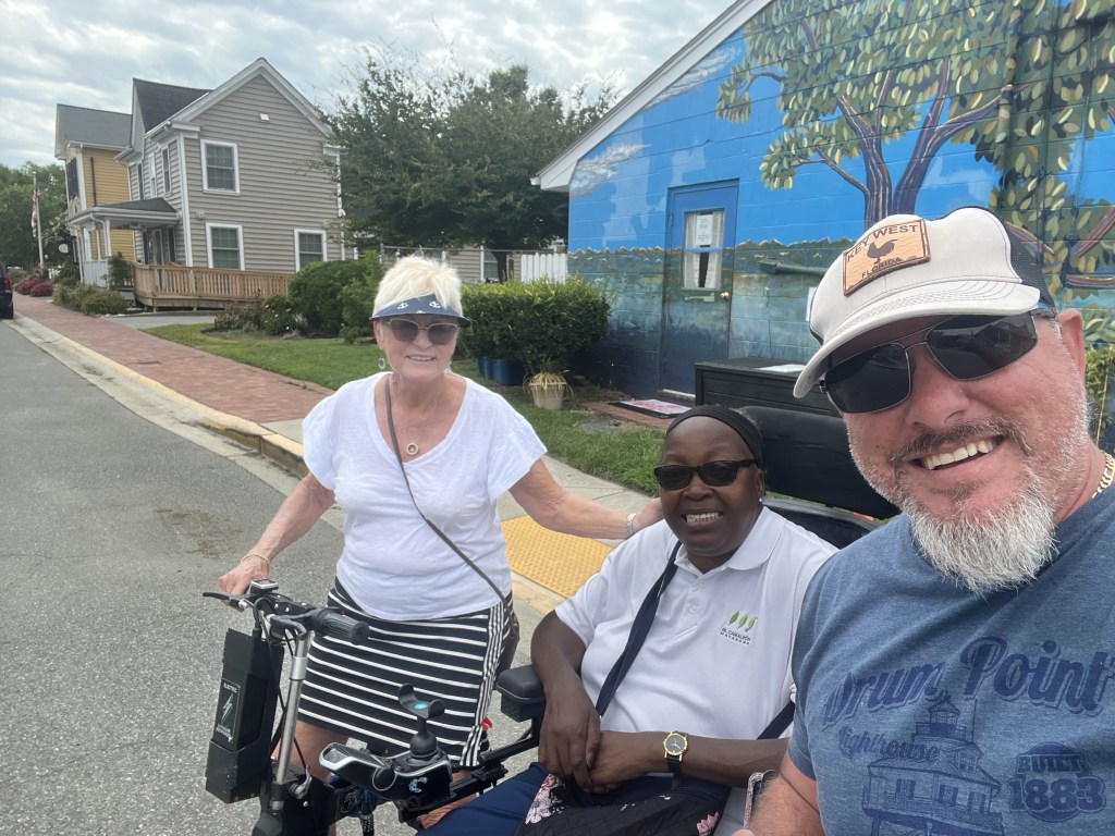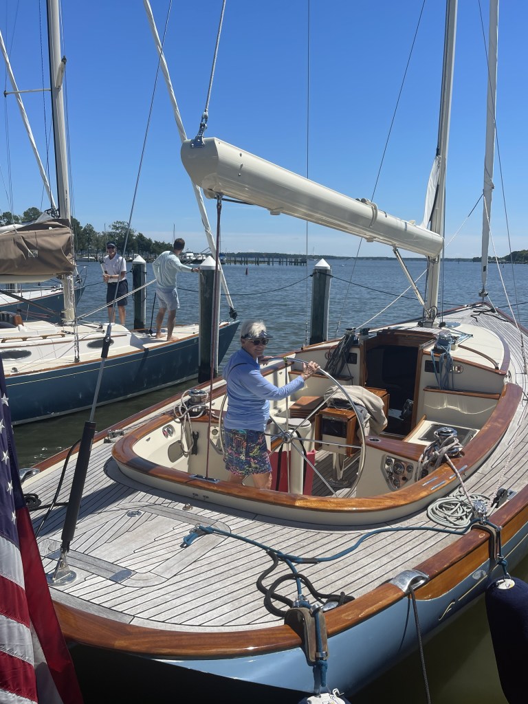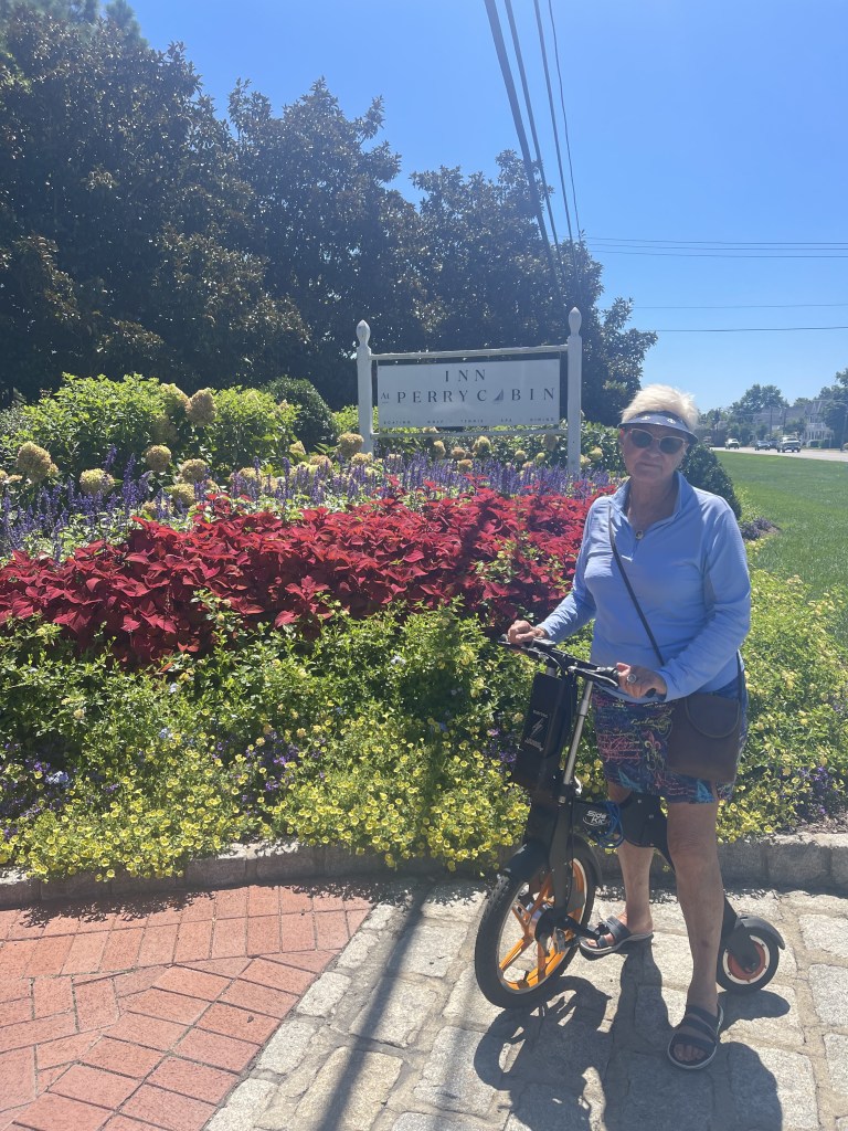 We left today at 10:10 AM. Heading for Saint Michaels Maryland. Easy run, beautiful day, about 1 foot seas. Had lunch here at the marina. We shared crab dip, they have the best crab dip we have had on this trip. Bartender gave us shots from a spiked jug that had vodka infused pineapple, wow, wouldn’t want to drink many of those. There was a couple sitting with us who have a home in Sarasota. What a coincidence so they gave us an idea for lunch here in Saint Michaels, Carpenter Street, saloon. Stopped at Saint Michaels winery for wine tasting. 8 tastings from wines around Maryland, I only liked the chocolate wine. Left there and on ride back to boat and I challenged a lady in her electric wheelchair for a race, she won lol. Check out photo. I listened to my book and Captain went swimming. This is the book I chose for book club, which is Rebecca. I hope it’s better than I think it’s gonna be. We got a little rain which was much needed. All done now and we’re going to ride bikes, uptown for dinner. Went to Limoncellos Italian restaurant. I had a wonderful meal of tuna Captain had a pasta. We started talking with a couple from DC, fun couple, he had a very strong Irish Brogue. They were drinking Limoncello Martinis and bought us each one, loved them!!! Yummy